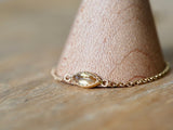 透明な黄色の中にだいだい色のインクルージョンがあり、石を裏から見ると真ん中に透明の直線が見えます。