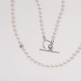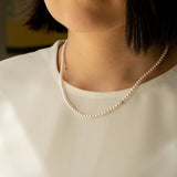 ベイビーアコヤパールとピンクダイヤモンドを一周留めたゴールドの球を繋いだネックレス。